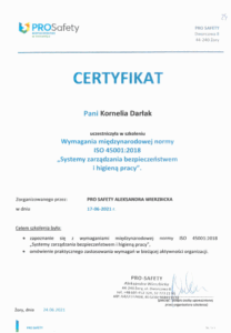certyfikat ISO 45001:2018 (systemy zarządzania BHP)