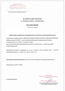 uprawnienia inspektora ochrony przeciwpożarowej, uzyskane w Centralnej Szkole PSP w Częstochowie