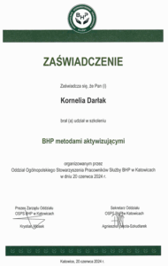 Jestem aktywnym członkiem Ogólnopolskiego Stowarzyszenia Pracowników Służb BHP, co pozwala mi być na bieżąco ze zmianami prawnymi i najlepszymi praktykami w branży.
